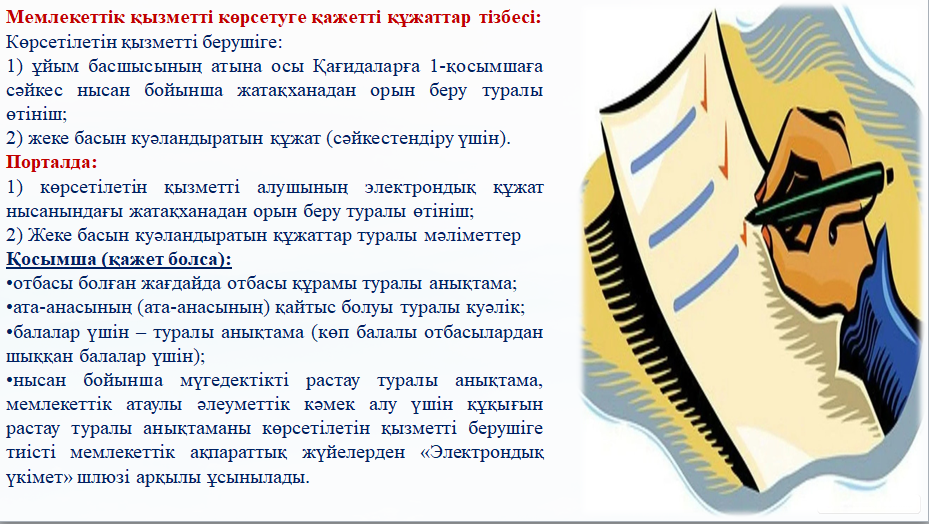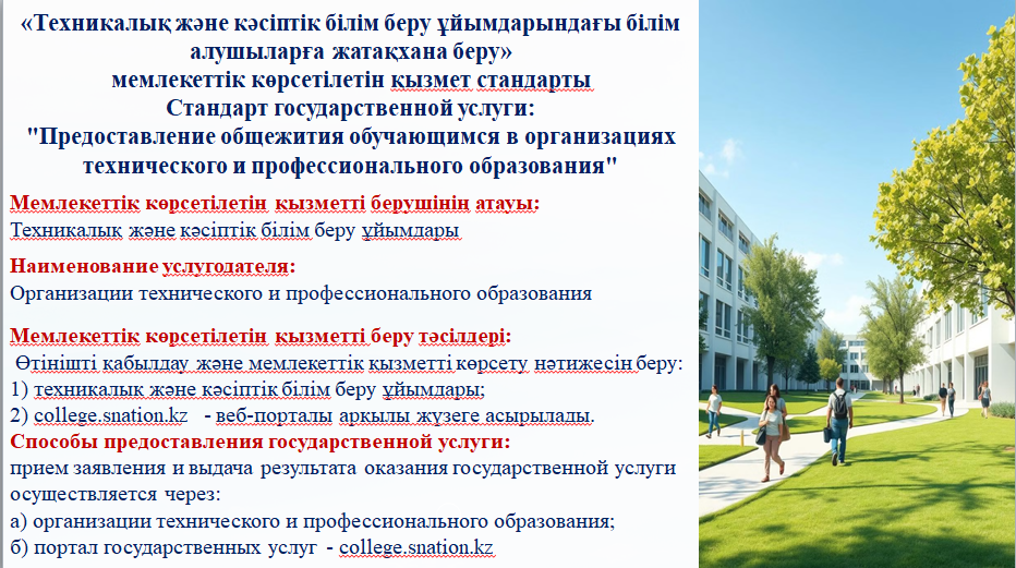 «Техникалық және кәсіптік білім беру ұйымдарындағы білім алушыларға жатақхана беру» мемлекеттік көрсетілетін қызмет стандарты