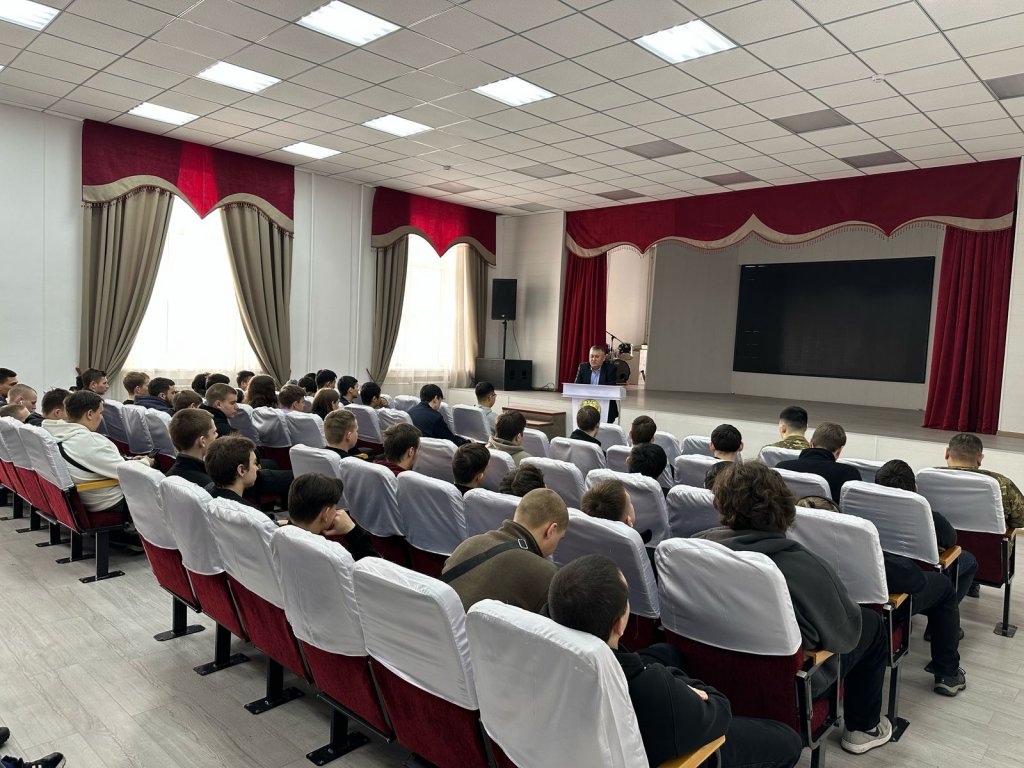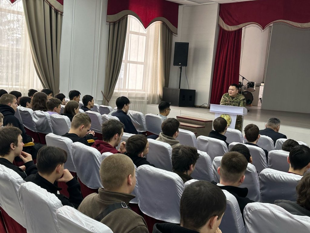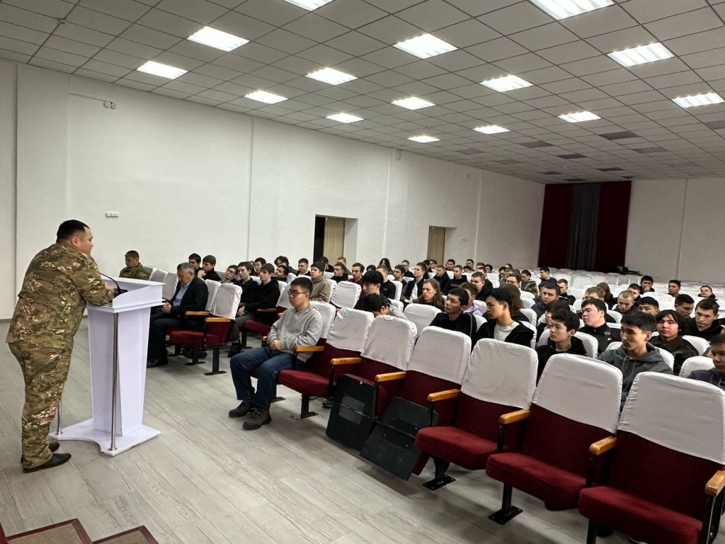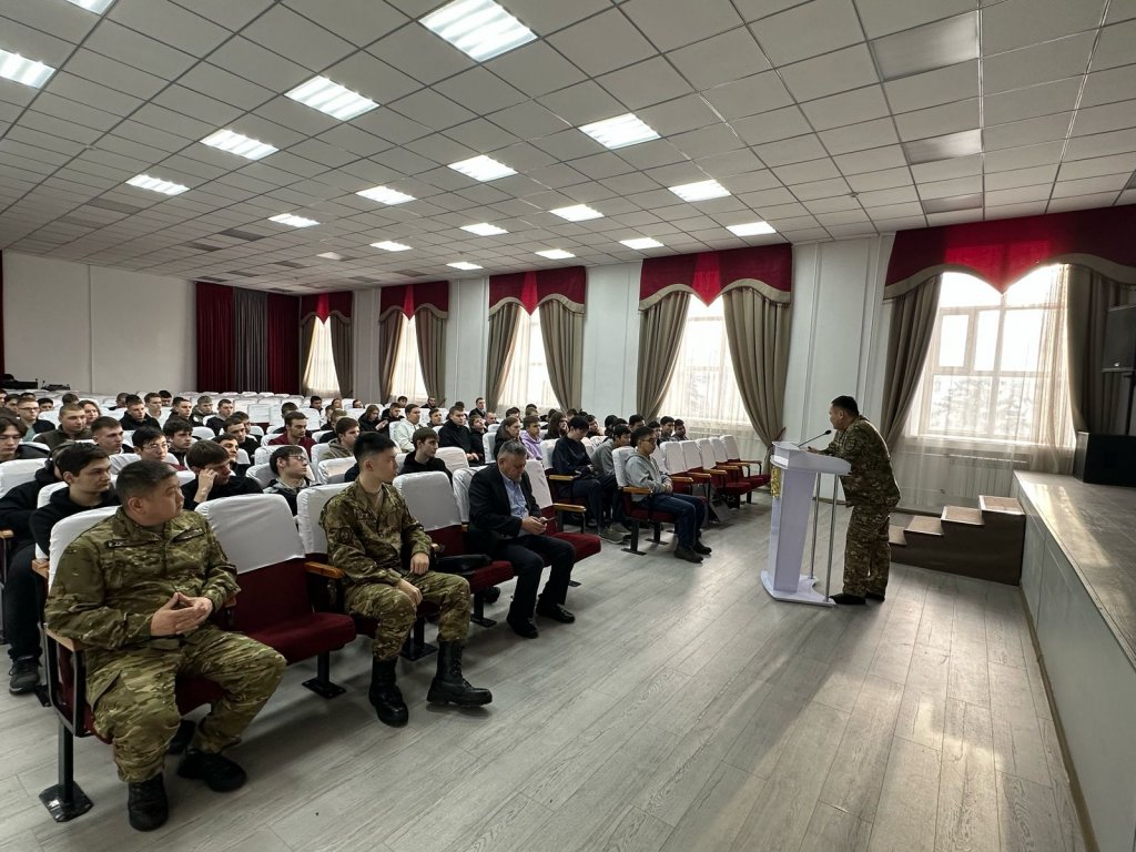 Әскери комиссар өз сөзінде студенттерді әскери қызметке шақыру ережелерімен таныстырып, түрлі әскер тектерінің қазіргі заманғы жарақтандырылуы, сарбаздар өмірі, сондай-ақ келісімшарт бойынша қызмет ету және әскери қызметшілердің жеңілдіктері туралы айтып берді.