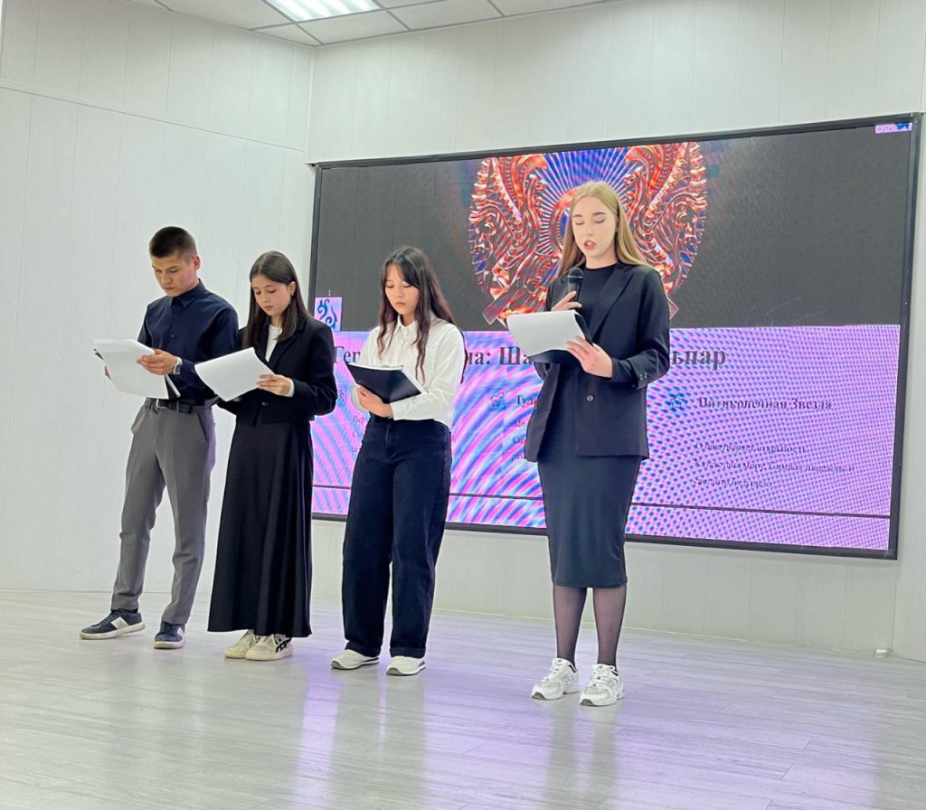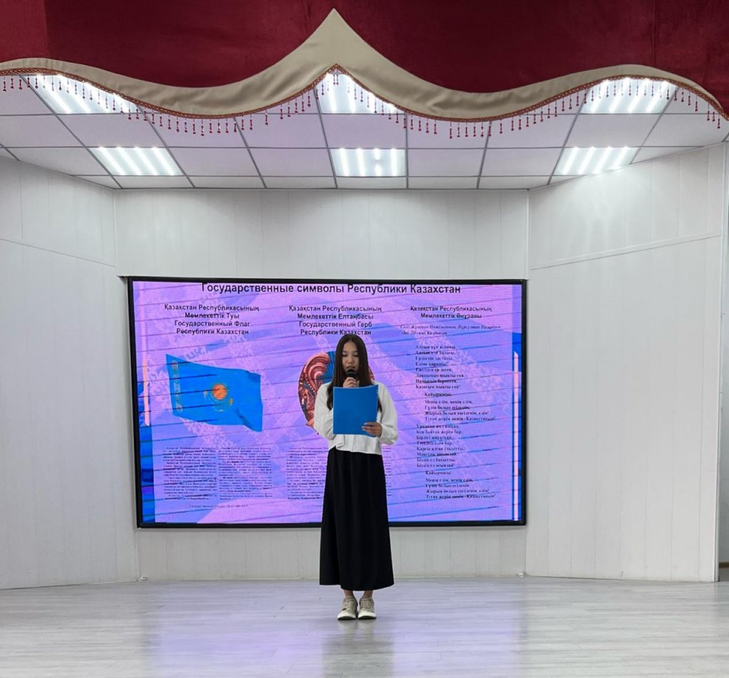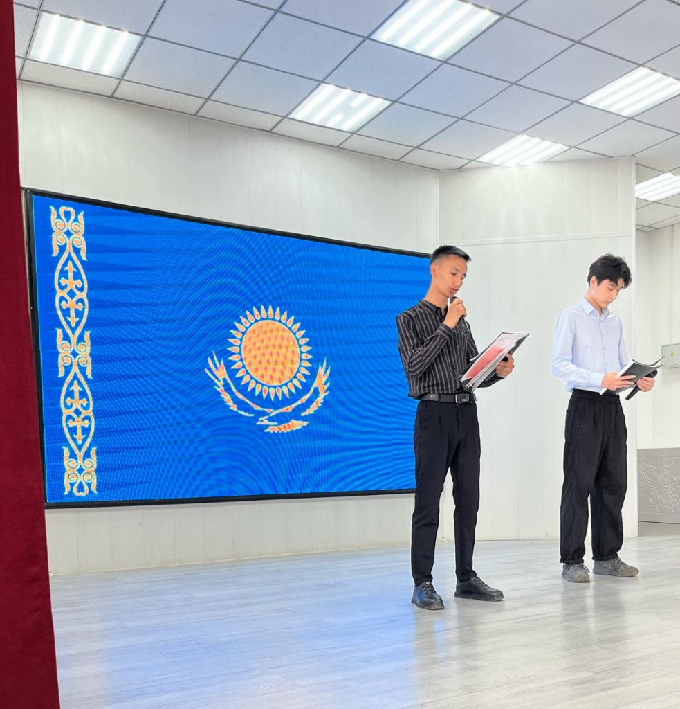 Іс-шара студенттер мен оқытушылар ерекше құрмет пен мақтаныш сезімімен орындаған ҚР Мемлекеттік Әнұранын орындаудан басталды. Жүргізушілер Мемлекеттік рәміздердің – Елтаңба, Ту және Әнұранның– ел тарихы мен мәдениетін, рухы мен болмысын айшықтайтын киелі белгілер екенін атап өтті. Олар тек ғимараттарды сәндейтін нышандар ғана емес, әрқайсымыздың жүрегімізде орын алған асыл құндылықтар. Студенттер дайындаған мазмұнды баяндамалар мен презентациялар арқылы рәміздердің шығу тарихы мен әрбір элементінің мәні кеңінен түсіндірілді. Ту мен Елтаңбадағы түстер мен бейнелердің символикасы, сондай-ақ Әнұранның елді біріктіретін қуаты, оның рухани маңызы ерекше аталып өтті. Осындай іс-шаралар жастардың бойында рәміздерге деген құрметті тереңдетіп, елге адалдық пен азаматтық жауапкершілік сезімін қалыптастыруға көмектеседі.