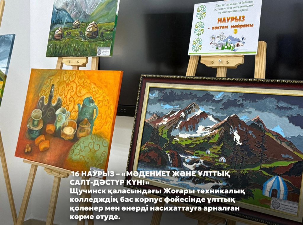 Щучинск қаласындағы Жоғары техникалық колледждің бас корпус фойесінде ұлттық қолөнер мен өнерді насихаттауға арналған көрме өтуде.